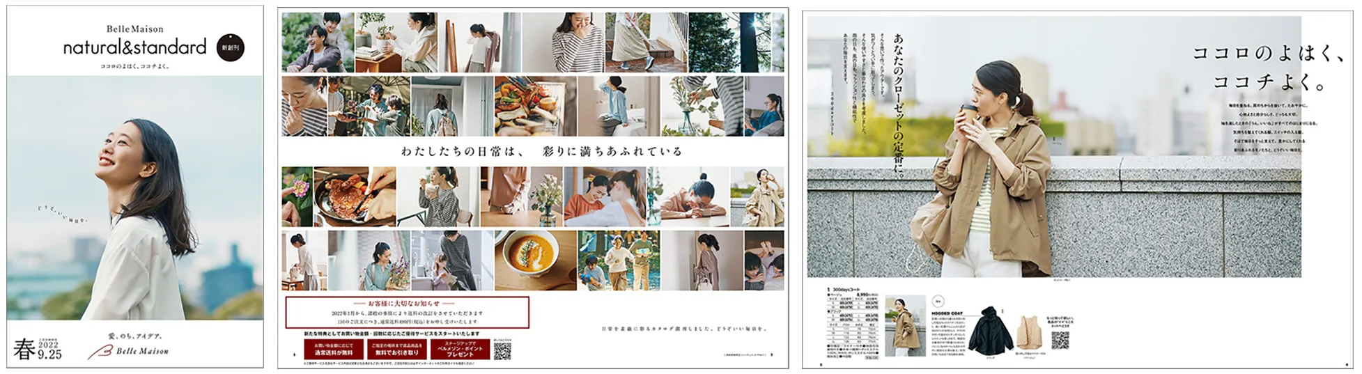 新カタログ「Belle Maison natural&standard」は、仕事と家庭の両立で毎日が忙しく、自分の為の時間がなかなか取れない女性に、“日常を満足して過ごすことで生まれる心の余白が気持ちの余裕となり、透明感のある美しさへとつながる“をコンセプトに、ファッションで心地良い暮らしを提案したいという想いから誕生しました。