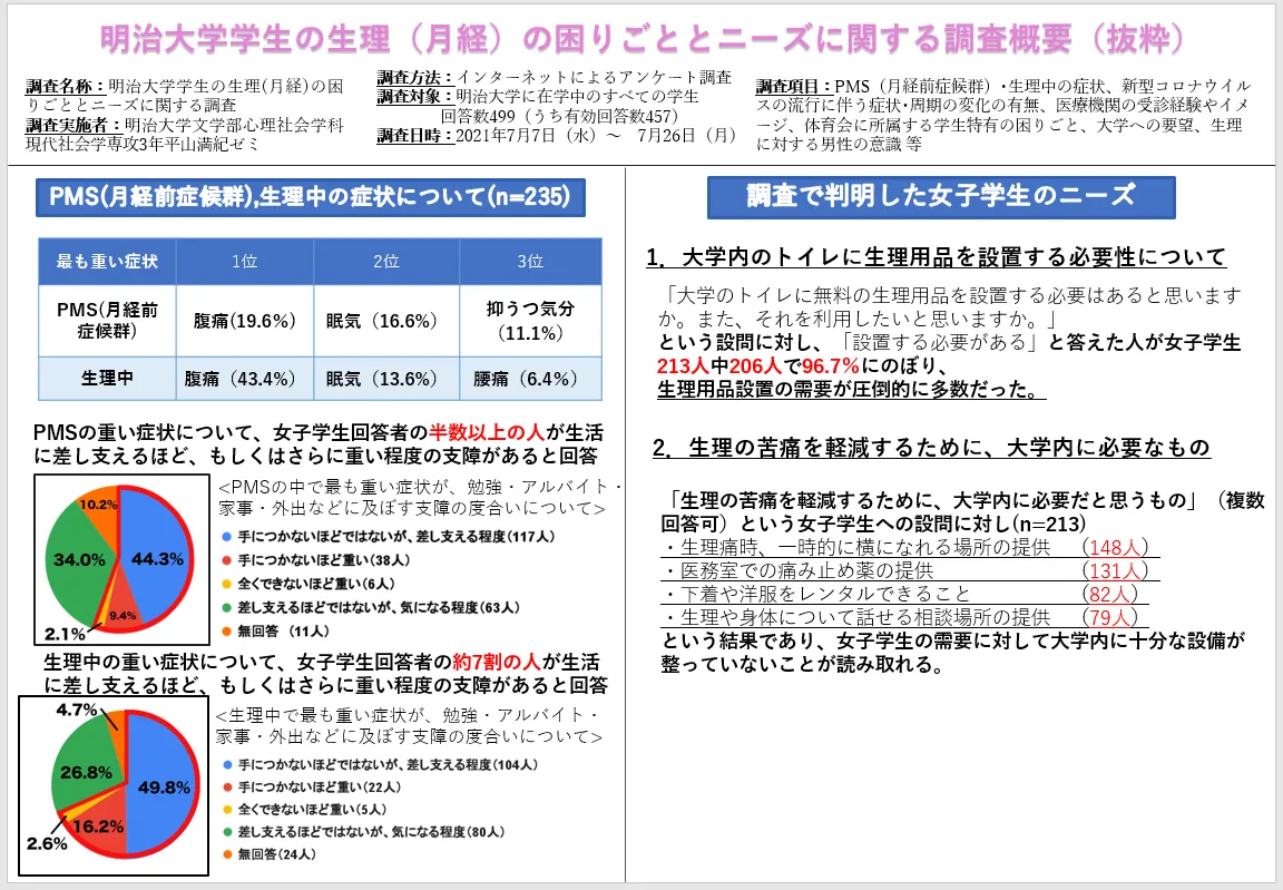 明治大学文学部心理社会学科現代社会学専攻の平山満紀ゼミナール(ジェンダーとセクシュアリティの社会学)は、明治大学の学生を対象(※)として、「明治大学生の生理の困りごととニーズに関する調査」を実施しました。この調査は、ゼミの学生が主体となり、女子学生の生理の苦痛に関する現状を明らかにしたうえで、生理の苦痛を軽減する活動に取り組むことを企図して行われました。