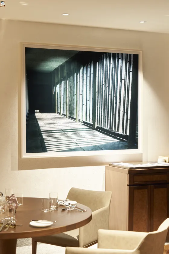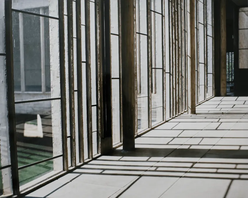 石塚が今回作品のモチーフとして選んだのはクセナキスの作り上げた譜面に記され、差し込む光によって、この場所で演奏されたシンフォニーである。石塚はラトゥーレット修道院の回廊で年間を通して奏で続けられる演奏の揺らぎの中から、冬至と夏至の日の場景を選び出している。これによって揺らぎの最大幅に線を引くこととなる。つまり、この日々揺らぎの中でつづく演奏を大きな塊、全体像としてその広さを捉えることとなる。また、本展ではコルビュジエとクセナキスの共同制作で、もうひとつの「オンデュラトワール」であるチャンディーガル美術大学(1965年竣工)の開口部の作品も提示する。このふたつの「オンデュラトワール」がみせる「ちがい」はある種のコントラストとなる。これによって、全体像として捉えたラトゥーレットの「オンデュラトワール」という曲の広さに別の軸を与え、作曲家クセナキスの見ていた揺らぐ世界を立体的に再構築する。今回、石塚が写真空間の再解釈で表現したのは音楽の立体化であり、それはまさに「音楽の建築」であると言える。