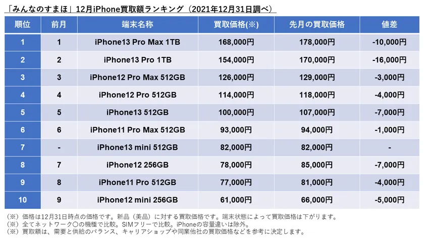 「みんなのすまほ」12月iPhone買取額ランキング(2021年12月31日調べ)