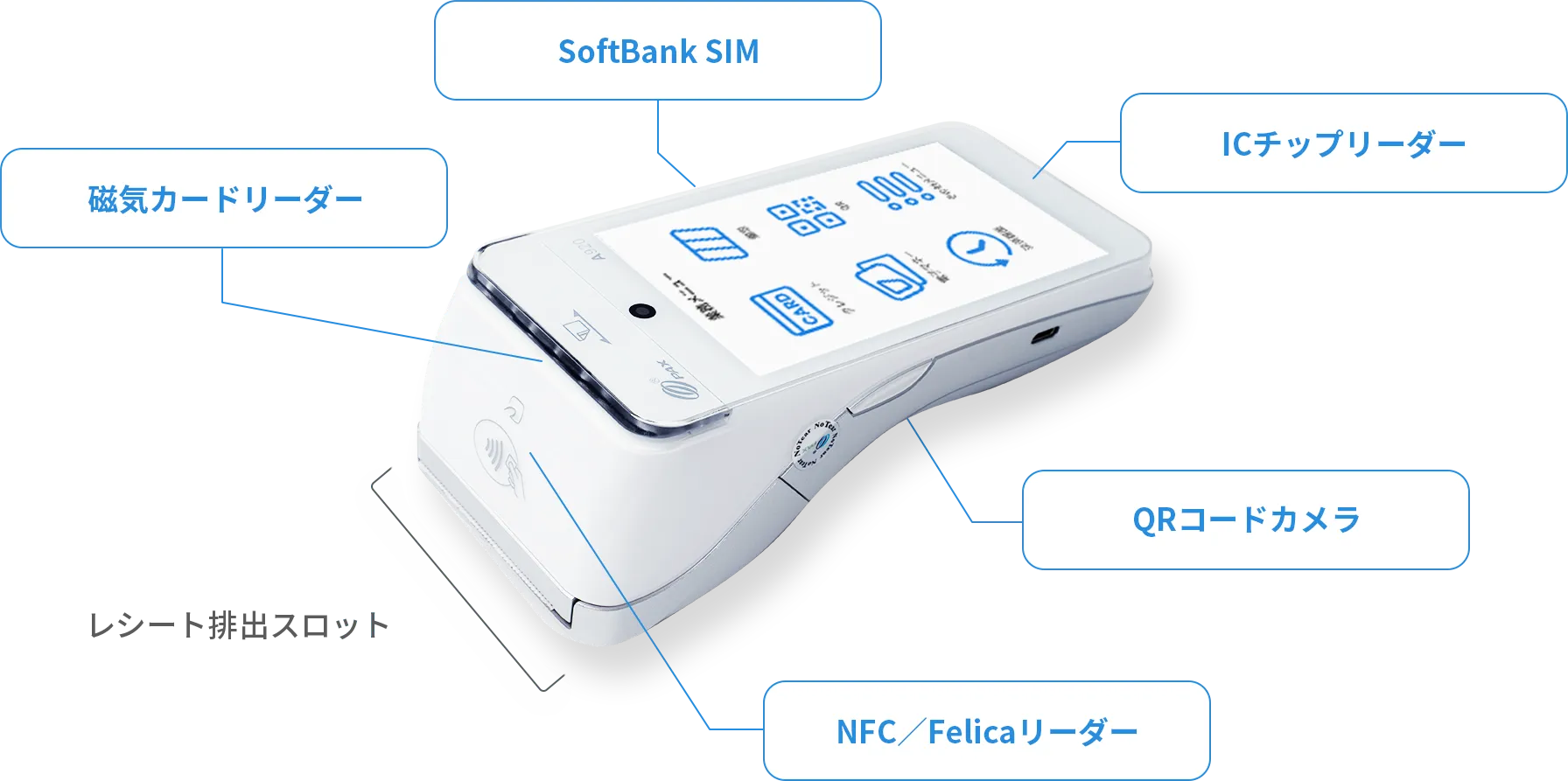 「PayCAS Mobile」は、片手に収まるサイズの決済端末で、クレジットカードから電子マネー、QRコード※2までさまざまな決済手段を利用できます。直感的な操作ができる5インチのタッチパネルディスプレイに加え、磁気カードリーダーとプリンターも搭載しており、決済からレシート印字まで端末1台でオールインワンに対応。すっきりとしたレジ周りを実現するとともに、SoftBank SIM対応で場所を選ばずどこでも決済できます。なお、POSシステムとの連動もWindows環境向けOCX※3を利用することで、スピーディーかつ低コストに開発が可能です。