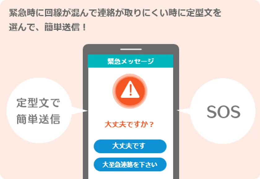 Peace Sign(ピースサイン)は、緊急時の安否確認機能を備えています。年々増えてくる地震や大雨などの自然災害時、電話が繋がり難い事も多く、離れて暮らすご家族が心配になります。Peace Sign(ピースサイン)は、アプリ内のボタンを押すだけで、登録されているかた全員に、安否確認通知を送る事が出来ます。安否確認通知を受け取った方はタップするだけで回答を返す事ができ、素早くお互いの安否を確認し合う事が出来ます。