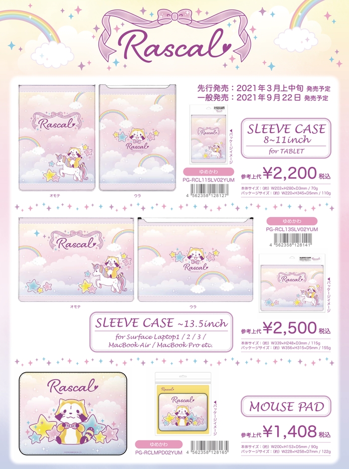 「ラスカル ゆめかわ」デザインの8~11inchのタブレットに対応した汎用タブレットケースです。外側には高級感のあるPUレザーを採用し、内側はタブレット本体を優しく包み込むスウェ―ド調の生地を採用しキズや衝撃からタブレットを守ります。軽量・スリム設計でカバンにもスッキリ収納。マウスパッドとしても使用可能なので外出先でのマウスの操作にも便利です。