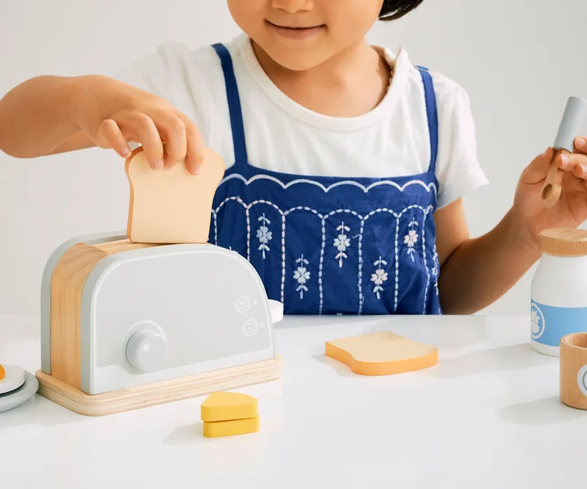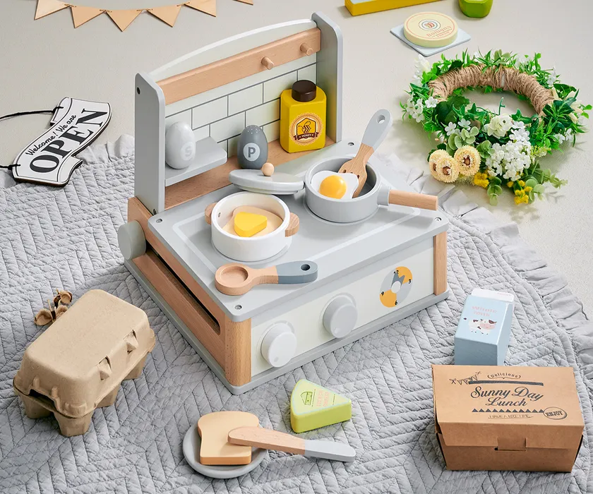 当社は長年、ままごと玩具を販売してきました。特に材質にはこだわり、プラスチックやスチールなどの玩具より、木のぬくもりを感じる木製品を主に取り扱っています。ままごと遊びは子どもの演技力や創造力などのさまざまな能力が身につけられることから、昨今では知育玩具として改めて評価され始めています。そこで当社は、代表的なままごと玩具であるキッチン型だけではなく、ミキサーやトースターなどの多様な小物玩具も販売することで、より子どもたちの知能的発達に貢献してまいります。卸売を通じて、より多くの人に遊んでもらうことを願っています。
