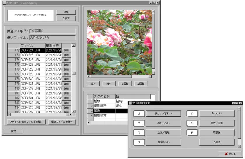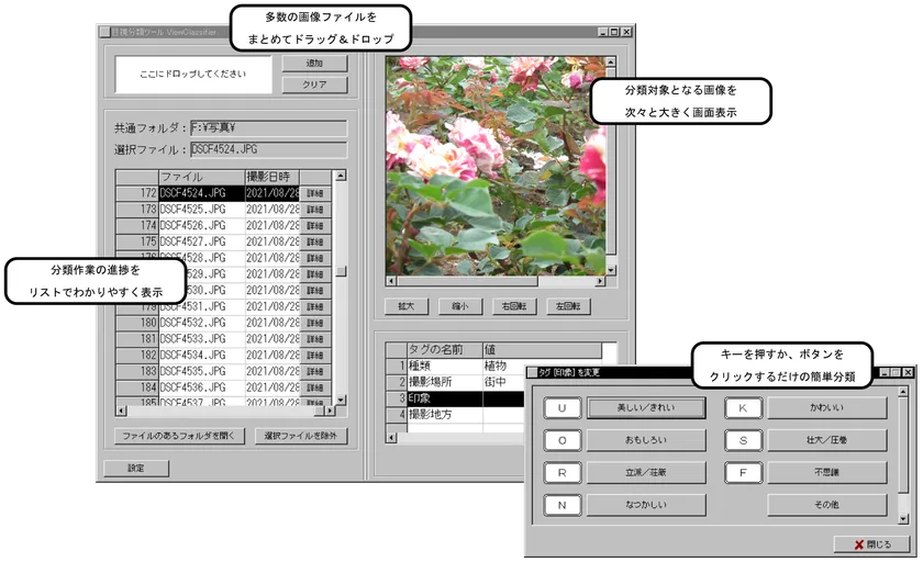 これに対して今回当社の開発した「ViewClassifier」を使うと、写真など画像ファイルの分類作業を大幅に省力化することが可能になります。「ViewClassifier」は、多数の画像ファイルを、簡単なドラッグ・ドロップ操作で一度にロードすることができます。そしてロードした画像を1枚ずつ大きく画面に表示し、分類がなされるたびに次々と切り替えていきます。