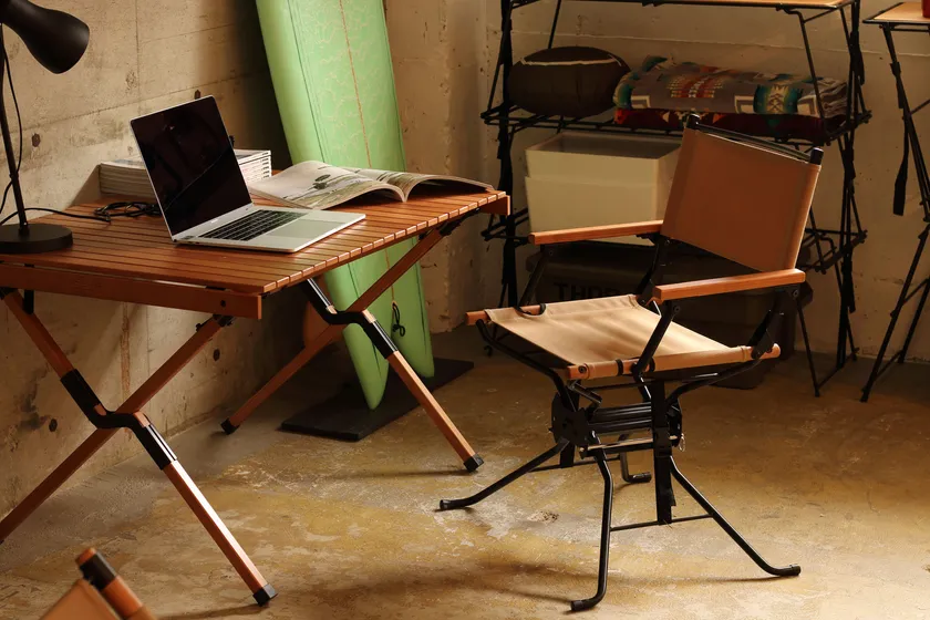 ディレクターズチェアという従来からある定番チェアをコンパクトに収納、高さ可変機能という設計を加えてアウトドアでもインドアでも使えるチェアを開発いたしました。