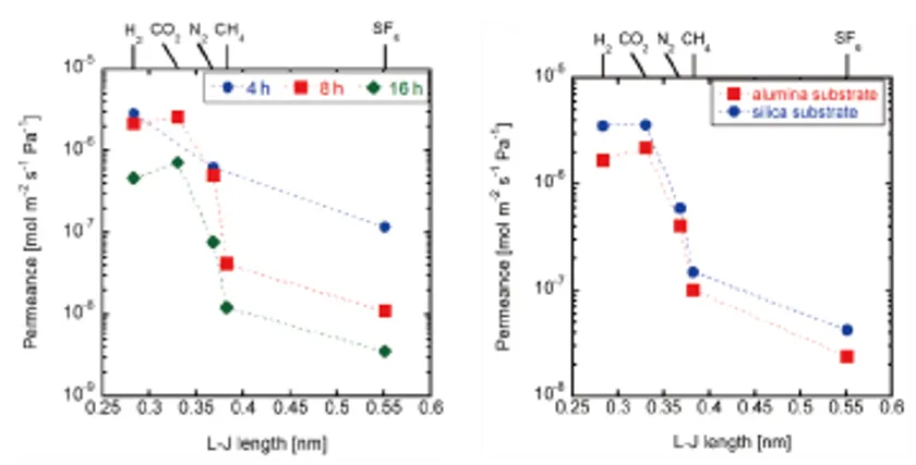 さまざまな合成時間と基材に対する単一ガス透過率 (左)150℃、8時間の合成時間で最も高いCO2透過率が得られた。(右)シリカ基材上で作製した膜のCO2透過率は、アルミナ基材上で作製した同程度の厚さの膜よりも高い。