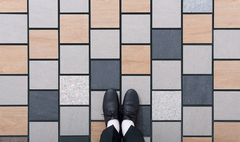 枠を置いて、タイルをはめるだけの2ステップ施工。遊歩道や外構まわりに用いられる石畳にかかる手間をできるだけ排除し、時短施工を実現。