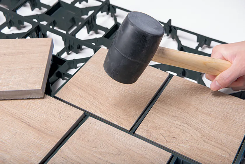 ・枠材を連結して敷き詰め、タイルを枠材にはめ込むだけで完結に施工完了。
