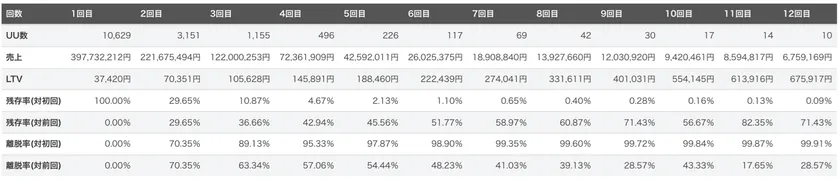 ・継続率分析(商品別・回数別のLTV・リピート率・顧客数・離脱率を分析)