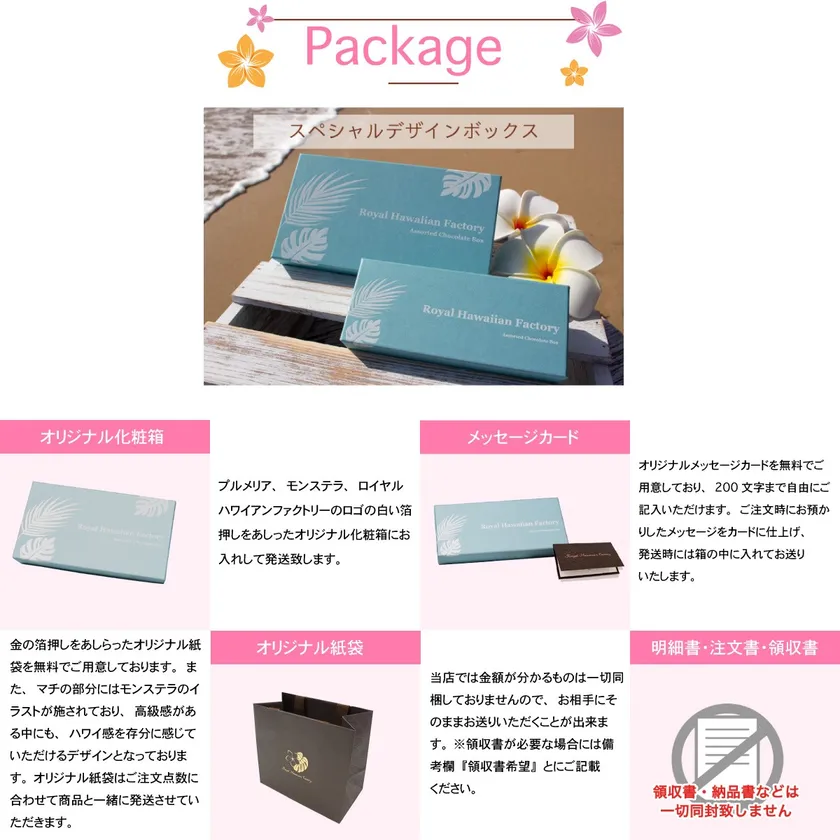 また、プルメリアとモンステラを特徴としたロイヤルハワイアンファクトリーのロゴを使用したデザインチョコレートが入っており、箱を開けた瞬間にハワイを感じてもらうことができます。