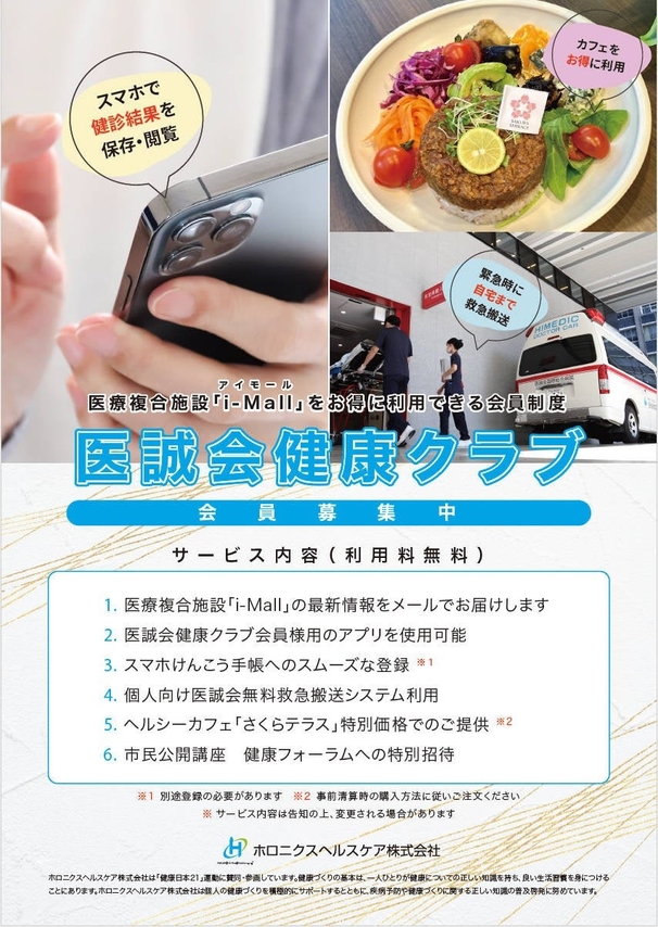 医療法人医誠会(本社:大阪府大阪市、代表者:谷 幸治)が運営する医誠会国際総合病院を含む医療複合施設「i-Mall」では、2024年1月よりi-Mallを便利にお得に利用できる会員サービス「医誠会健康クラブ」(運営会社:ホロニクスヘルスケア株式会社)のサービス内容をリニューアルしました。これまでのサービスをバージョンアップし、医誠会国際総合病院に適した新たな特典を追加。より多くの皆さまに、より便利でお得にi-Mallをご利用いただけるようになります。