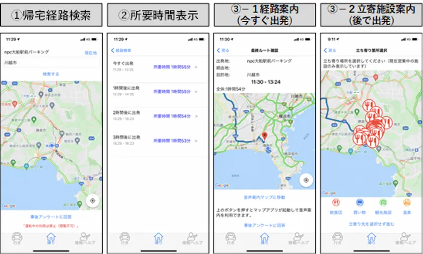 ● アプリ「スイスイ旅」の機能の一つである、今すぐ出発する場合と後で出発する場合の帰宅先までの所要時間の違いにより、モニターがどのような行動をとるのかを、属性の違いや立ち寄り箇所、消費金額等について、アンケート調査やスマートフォンのGPS機能により検証します。