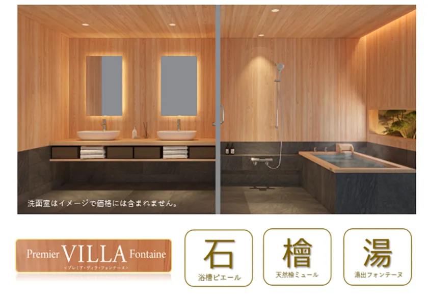 【和 WABURO 物語】第4章 ~コロナ禍で需要の高まる別荘仕様、 「厳選自然素材」と「湯浴みフォンテーヌ」の融合~ 「石×檜×湯」フォンテーヌ仕様 ユニットバス“Premier VILLA Fontaine”