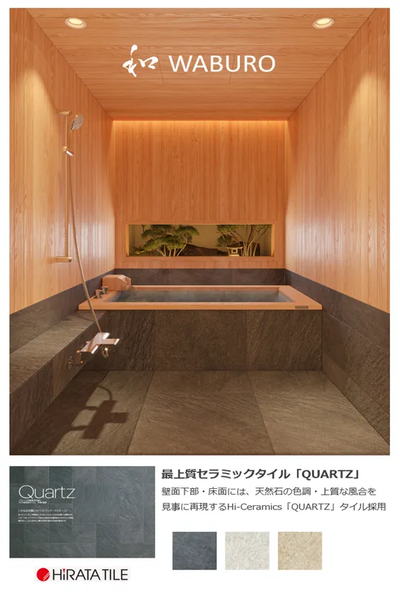* 浴室全体構成として、壁天井を覆う「天然檜」とベストマッチするシンプルトーンで飽きのこない質感豊かな天然石の色調・最上質な風合いの「Hi-Ceramics」QUARTZ(平田タイル社製)を壁下部と床面に採用。