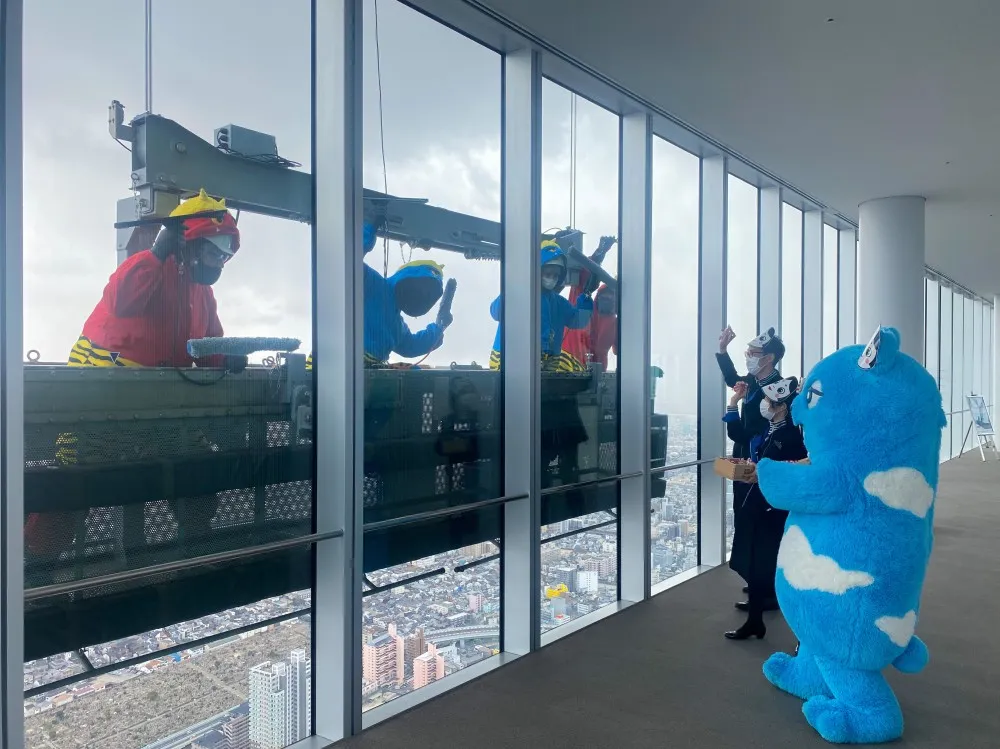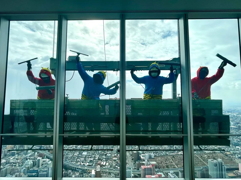 あべのハルカスでは、いつでもお客さまに美しい景色をご覧いただくため、定期的に外壁ガラスの清掃を行っています。ゴンドラに乗って地上約300メートルの高所で清掃している作業員をご覧になられたお客さまは、大変驚き、一緒に写真を撮影されるなどお楽しみいただいています。