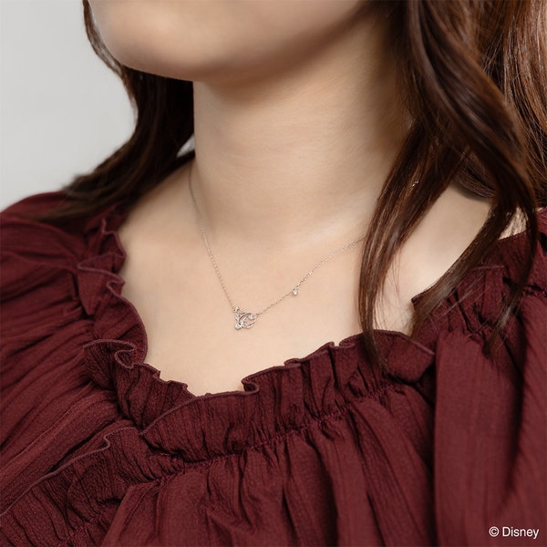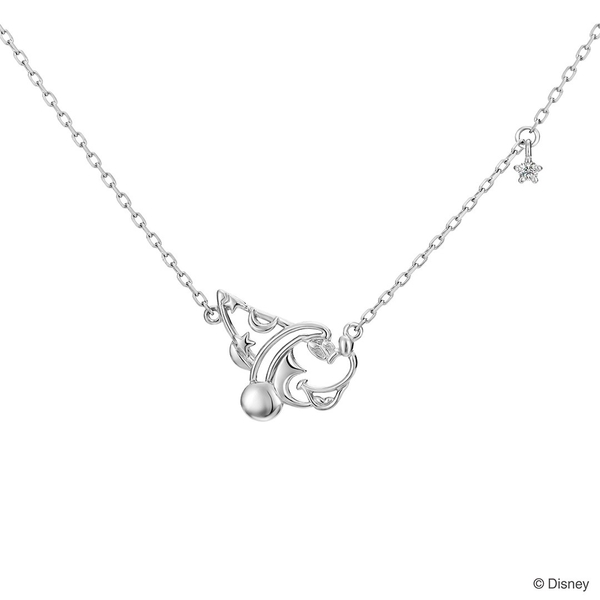 『魔法使いの弟子』に登場する「ソーサラーハット」をかぶった「ミッキー」の姿を楽しめるネックレス。「ミッキー」の目線の先には、5点の爪留めで星をイメージしたダイヤモンドが輝きます。
