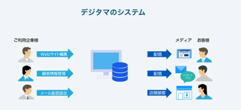 「デジタマ」は、中小規模事業者のデジタルマーケティングを支援する統合型顧客管理サービスです。「デジタマ」という製品名には、デジタルでカスタマー(お客様)を玉(ギョク)のように大切な対象として大事に育てていく、絆を深める、寄り添う、という意味を込めており、「OPTiM Digital Marketing」に搭載されている豊富な製品機能を元に、小売業に特化した店頭接客管理、Webサイト編集、顧客情報管理、メール自動配信の機能を中小規模事業者向けに集約して提供します。