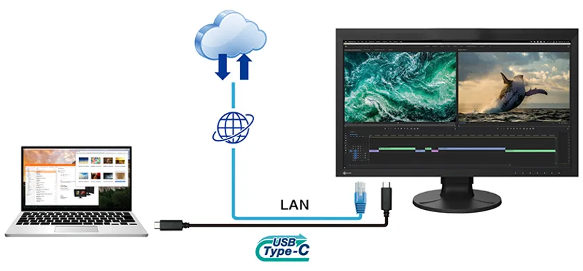 付属のUSB Type-Cケーブル1本のシンプルな接続で、画面表示、USB信号の伝送、PCへの給電、安定した有線LAN接続を実現します。
