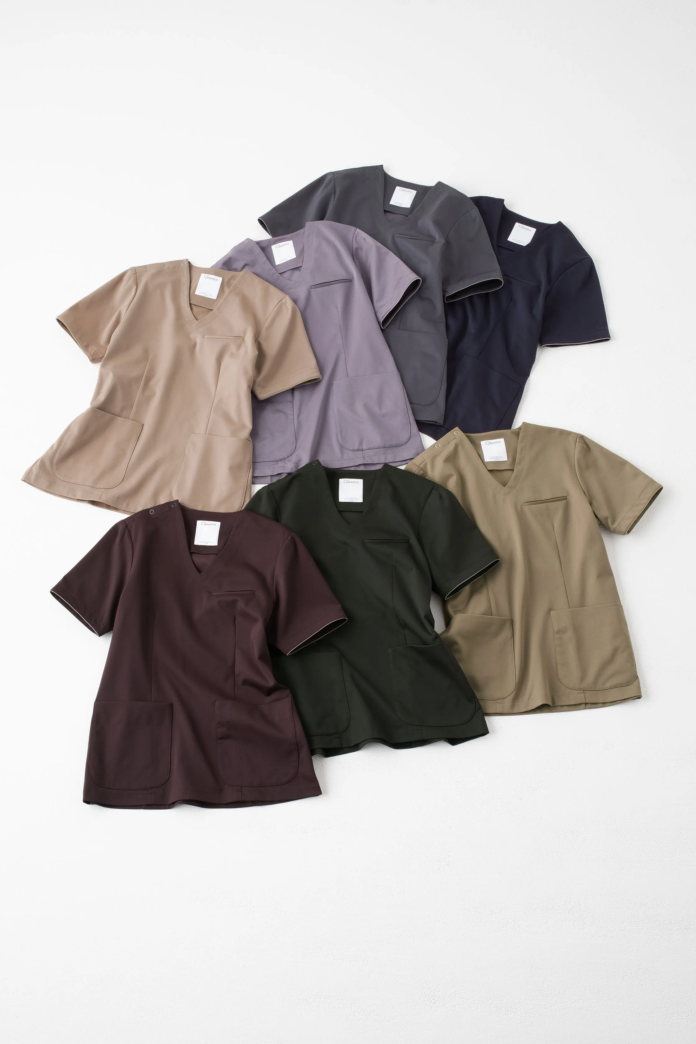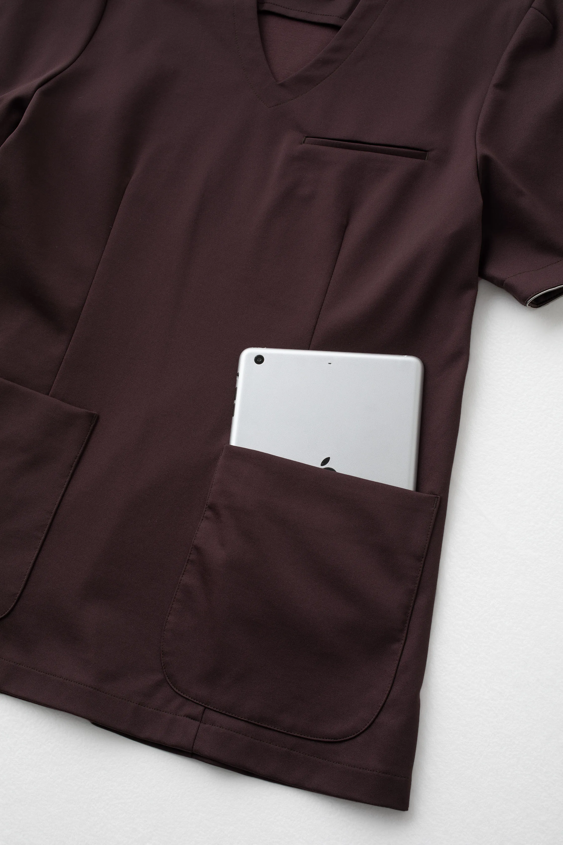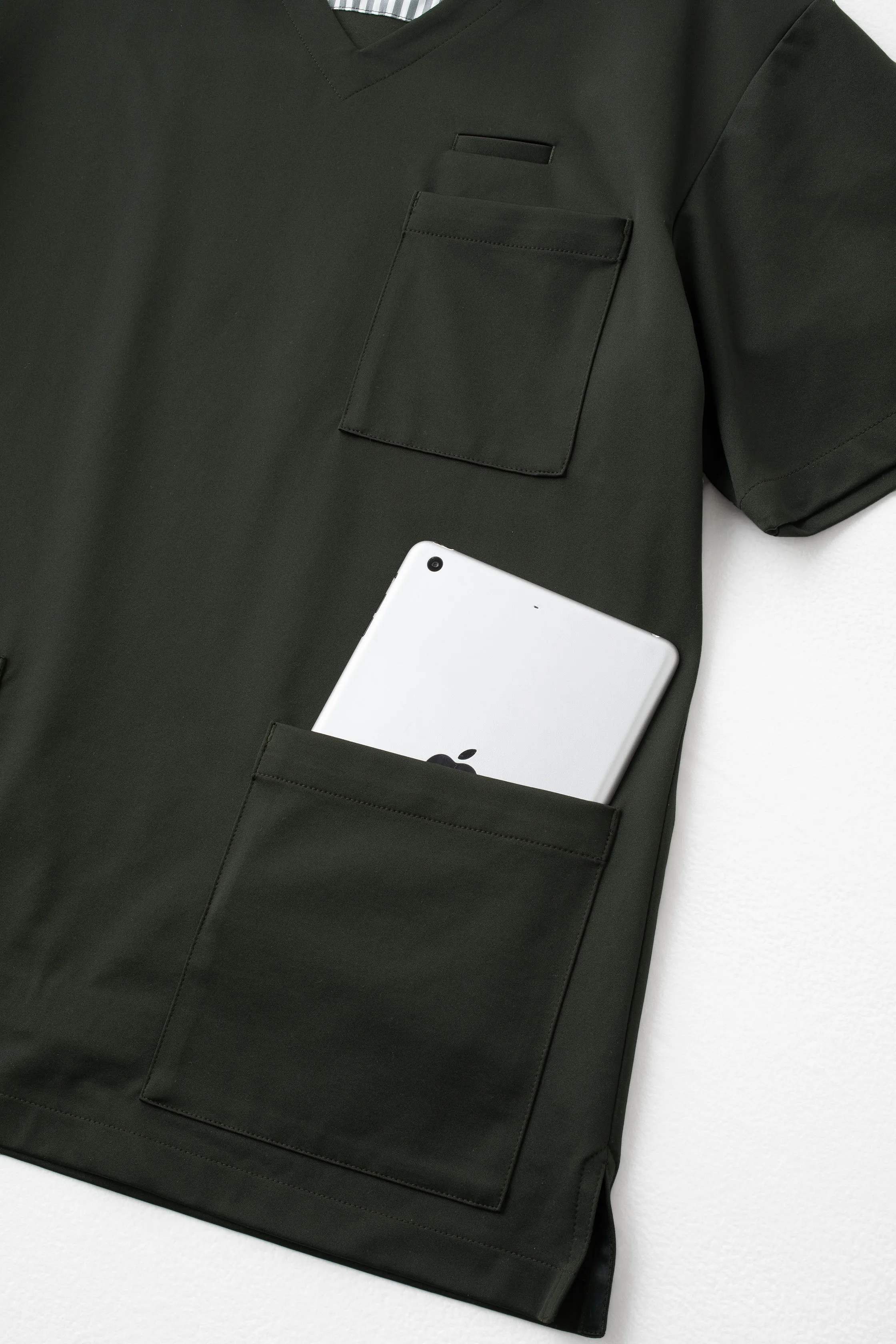 デザインは着丈や袖周りなどを小さめに、胸元を開きを抑えたVネックにすることでモード感が加わり、スタイリッシュな印象に。また、腕を上下する際にストレスを感じないように、腕周りの形状、袖山の設計を改善。脇ポケットは7.9インチのタブレットも入る使い勝手の良い大きさ。右脇ポケットの中は小物を収納できるコインポケット付きで機能性にも徹底的にこだわりました。上質で快適な素材とモードでスタイリッシュなデザインがマッチした、新しいスタイルのスクラブです。