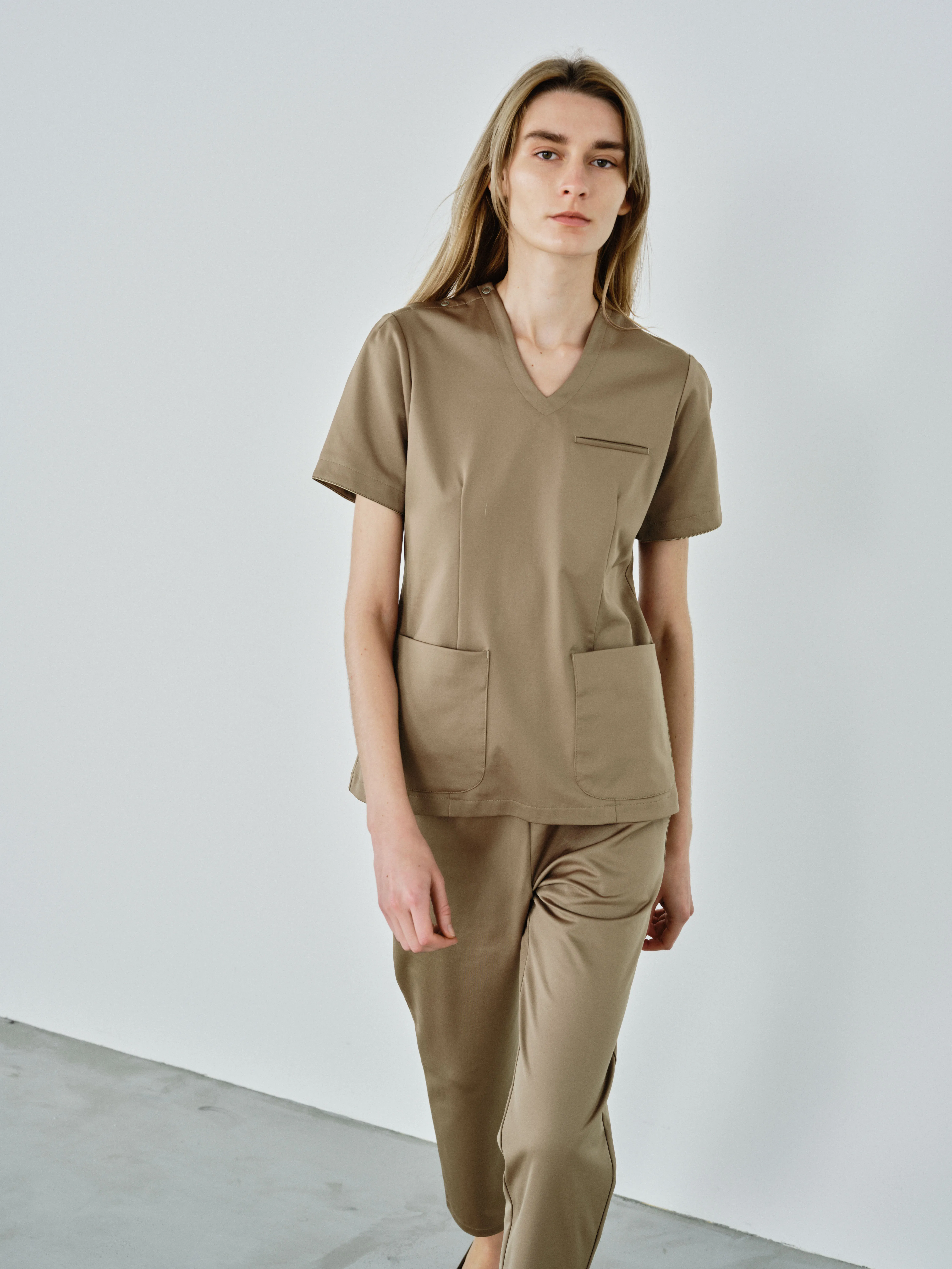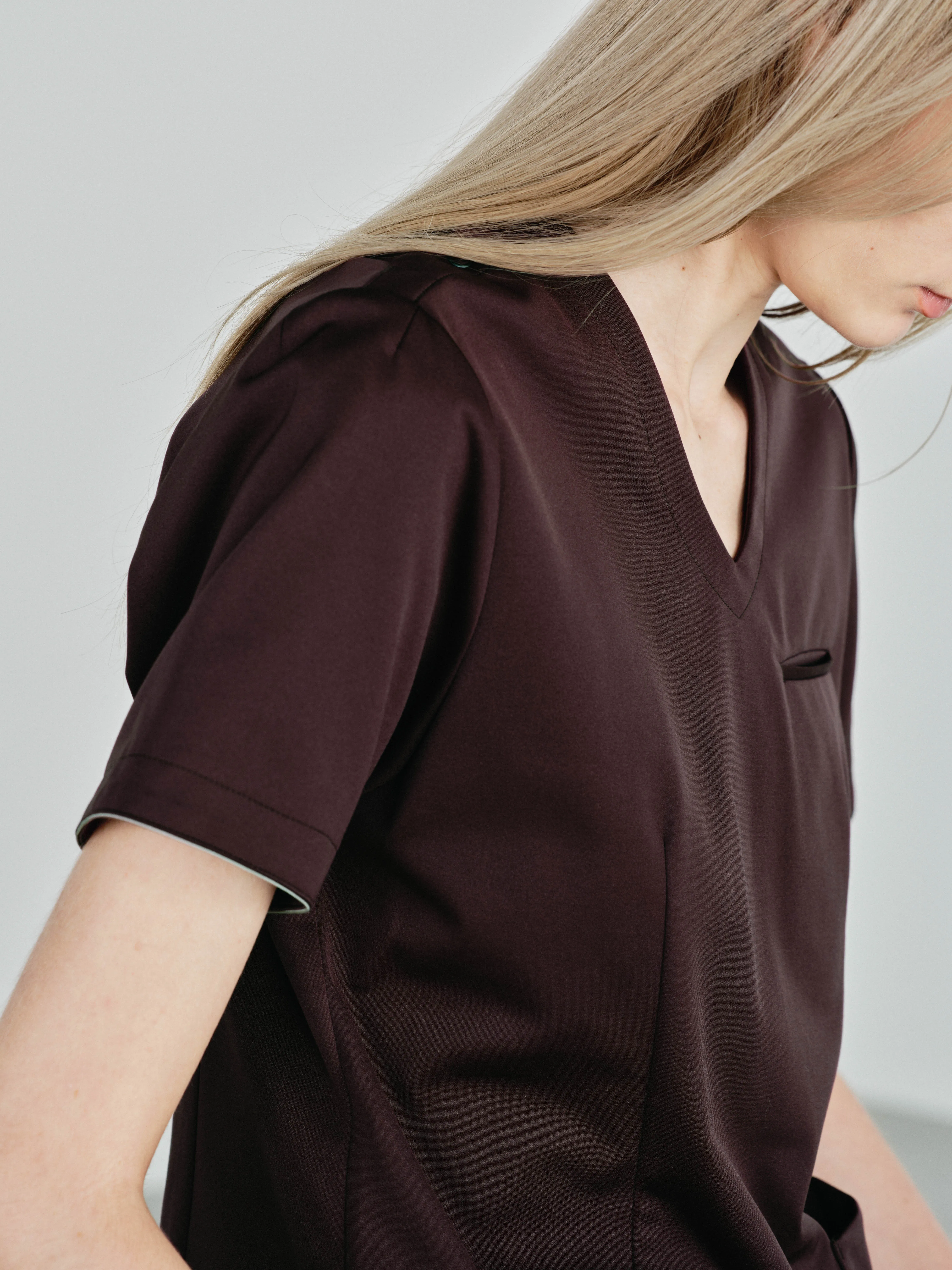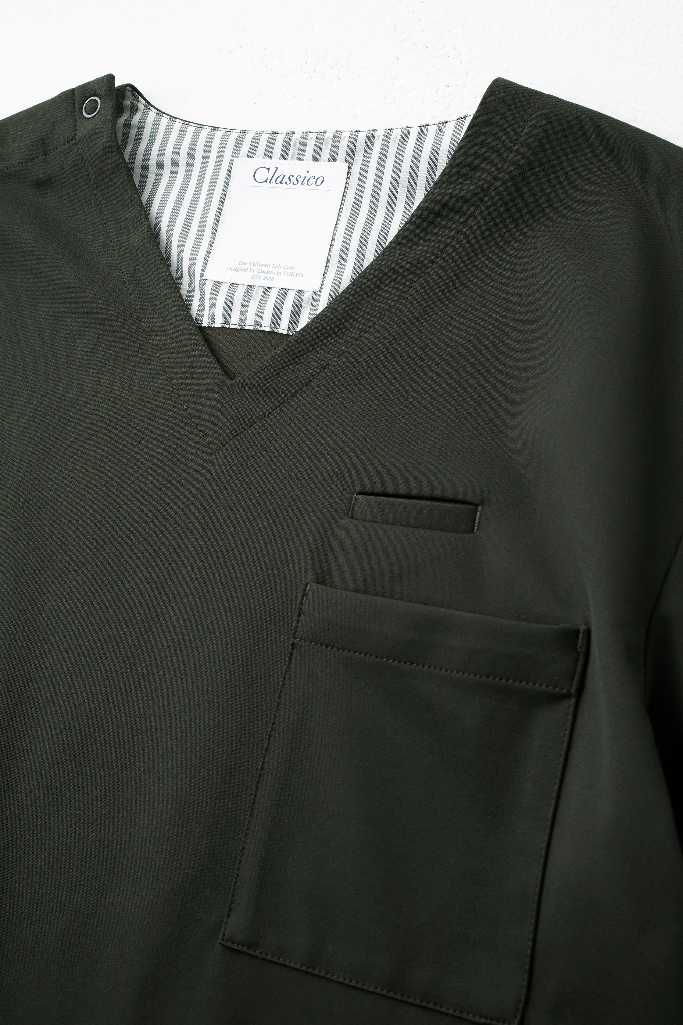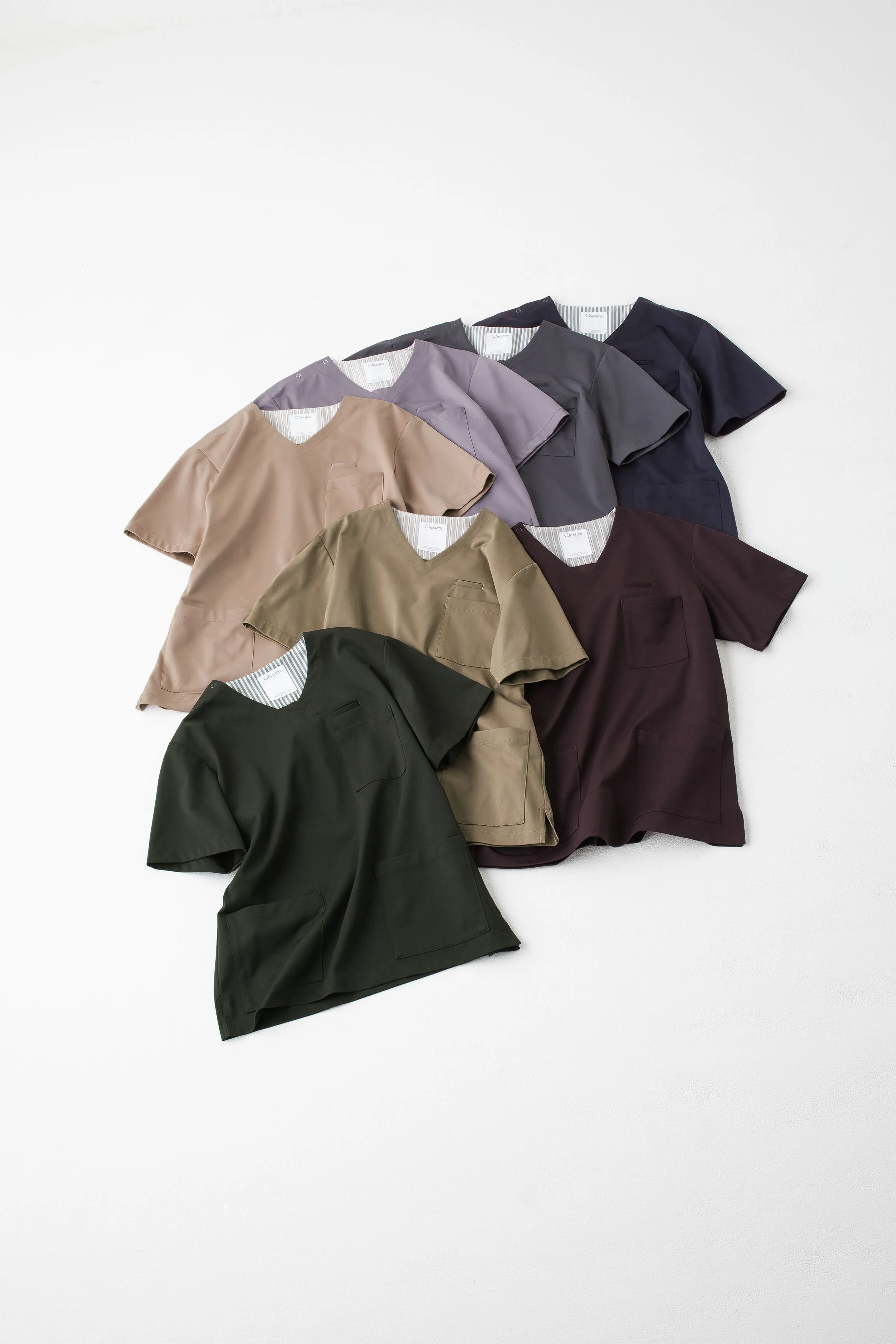 デザインは着丈や袖周りなどを小さめに、胸元を開きを抑えたVネックにすることでモード感が加わり、スタイリッシュな印象に。また、腕を上下する際にストレスを感じないように、腕周りの形状、袖山の設計を改善。脇ポケットは7.9インチのタブレットも入る使い勝手の良い大きさ。右脇ポケットの中は小物を収納できるコインポケット付きで機能性にも徹底的にこだわりました。上質で快適な素材とモードでスタイリッシュなデザインがマッチした、新しいスタイルのスクラブです。
