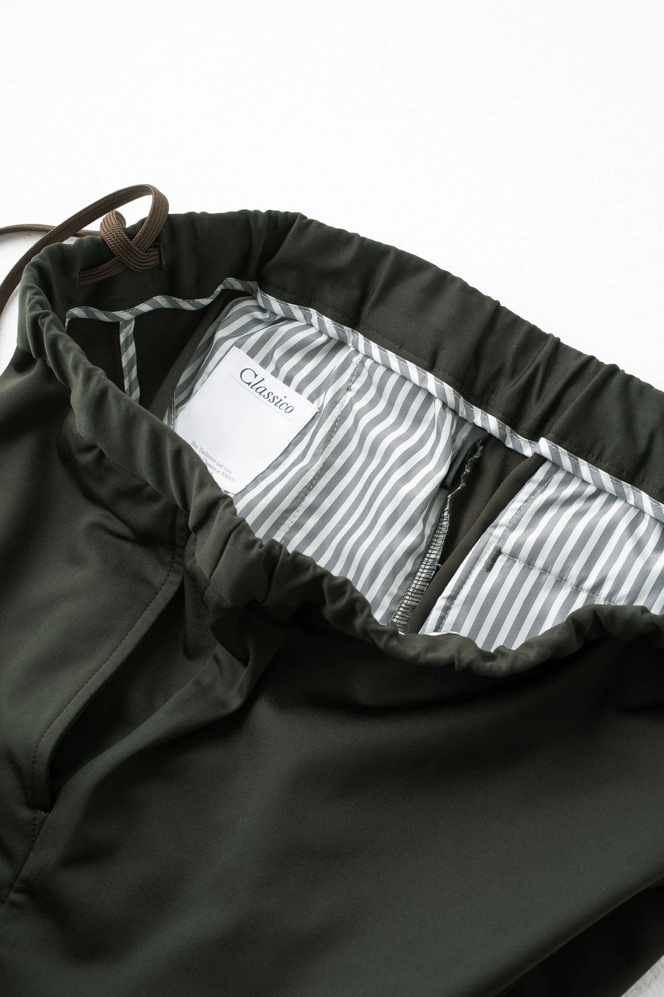 パイピングなどにはカラートーンと合わせたイタリア「ALBINI社」の上品なシャツ地を採用。ウエスト紐は内側で、すっきりとした印象に。