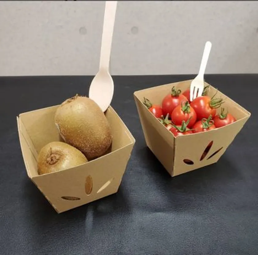 側面に空気孔のある紙容器・木のスプーンとフォーク