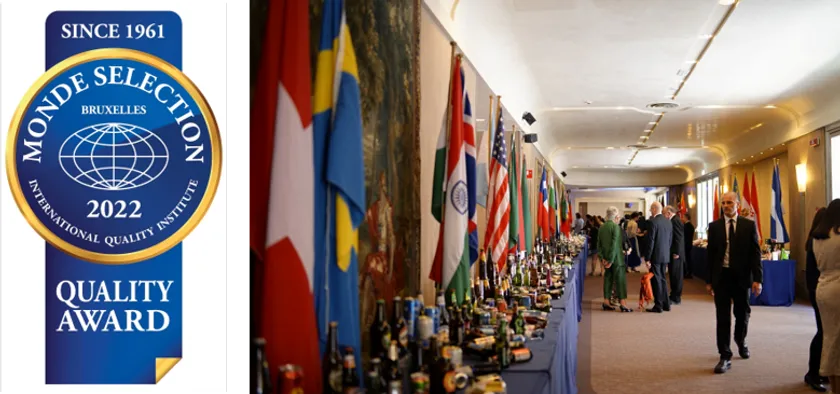 モンドセレクションのロゴ(左)と、2019年度のローマ授賞式のレセプション風景(右)