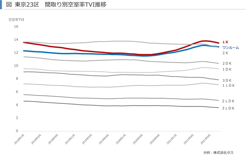 トピックスとして「東京23区の30代人口流出が増加したのはなぜか」と「東京23区の単身者向け賃貸住宅の空室率に回復の兆し」を掲載しています。また賃貸住宅指標は2021年11月期の空室率TVI(タス空室インデックス)、募集期間、更新確率、中途解約確率、賃料指数)を掲載しています。