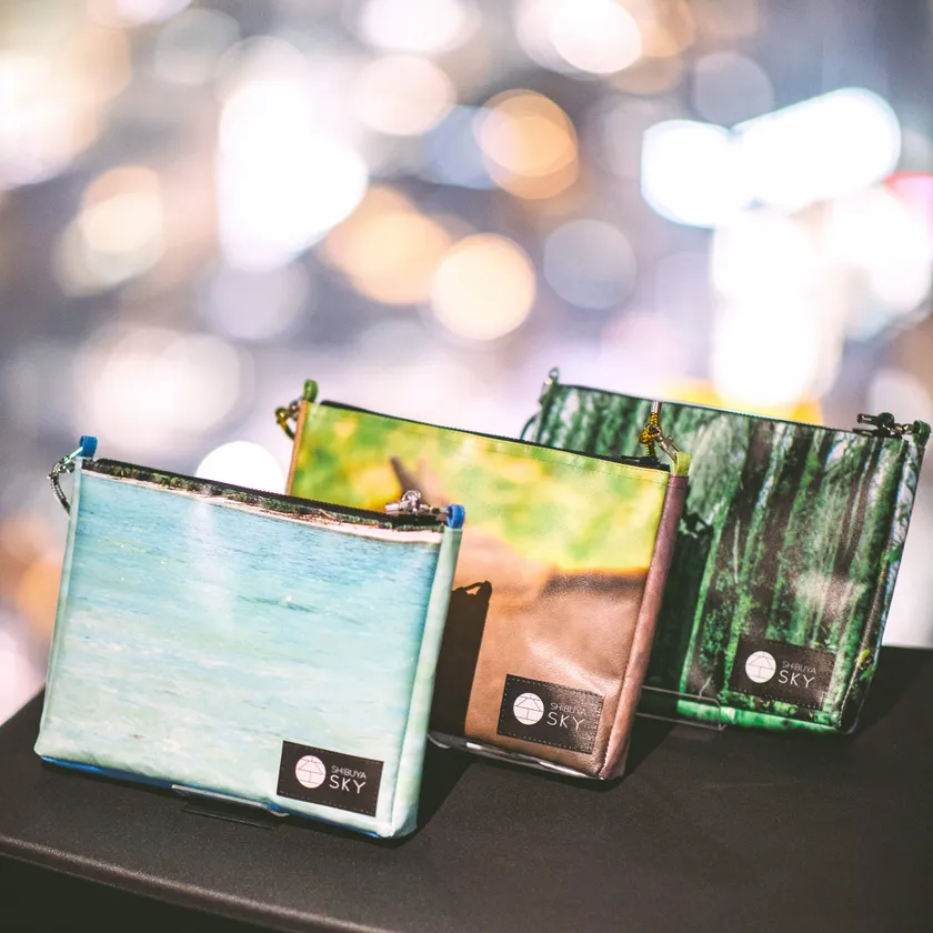 実際に回収した素材を再利用した事例をご紹介します。2021年11月に渋谷スクランブルスクエア13階にある「渋谷スカイ」で開催されたTRANSIT主催の写真展で使用していたターポリン幕を、廃棄することなくトラベルポーチにアップサイクルし、応募者へプレゼントしました。回収と商品化をサポートすることにより、廃棄されるはずだった素材を新しい価値に変えた一つの事例となります。