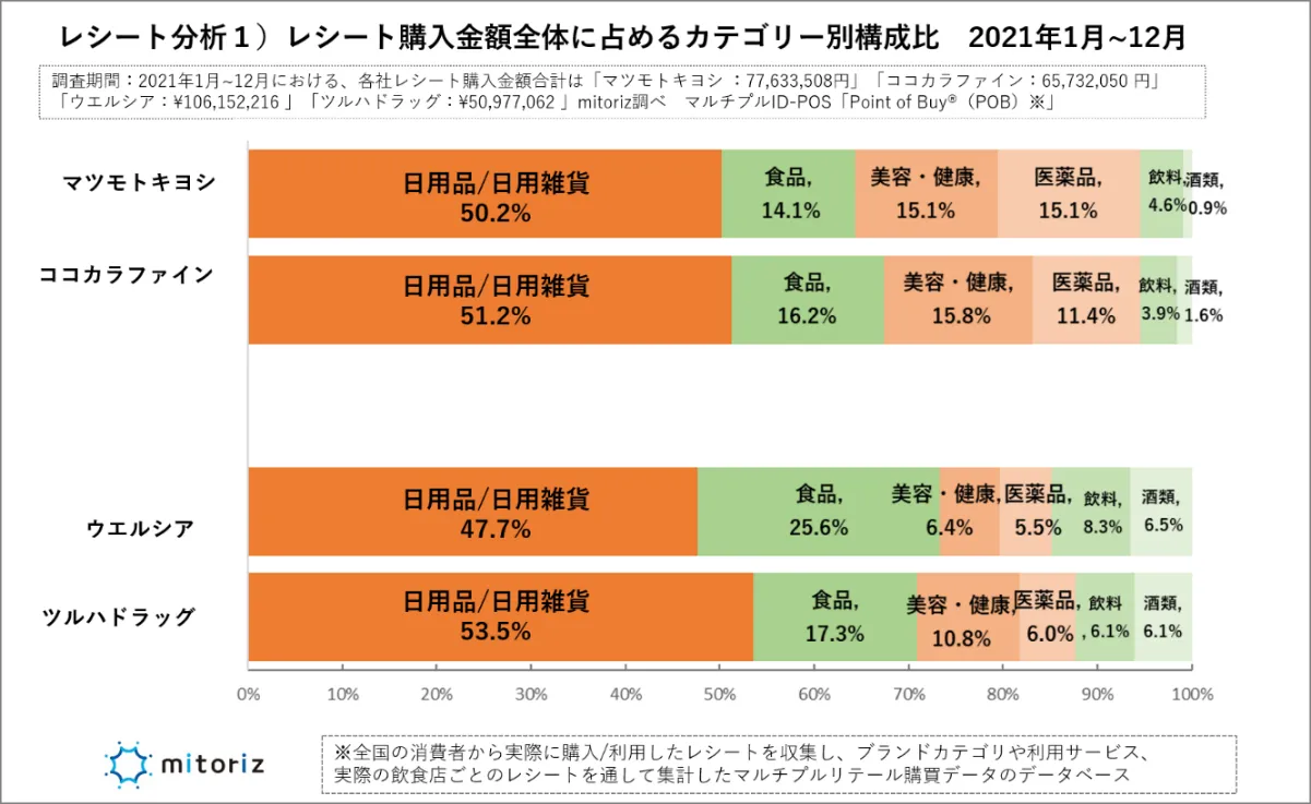 そこで今回は、2021年7月に全国のPOB会員を対象に実施した「ドラッグストアの利用」に関するアンケート結果から、「マツモトキヨシ(667人)※()人数はメーン利用者」「ココカラファイン(274人)」比較対象として、「ウエルシア(835人)」「ツルハドラッグ(352人)」をメーン利用すると回答した2128人のアンケート結果と、2021年1月~12月の4社の購入レシート226,240枚から、購買行動を分析しました。消費者アンケートをもとに、次の一手に迫ります。