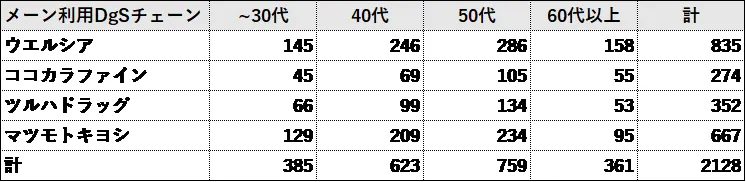 一方、「ウエルシア(N=835人)」は、メーン利用者の6割近くが「関東(56.9%)」となりましたが、郊外の出店が多く、「ツルハドラッグ(N=352人)」は、地場の「北海道(35.2%)」が3割以上となり、「マツキヨココカラ」としては、今後訪れる人口減少による市場の縮小を受けにくい、大都市を押さえることができていることが、大きな強みになると思われます。