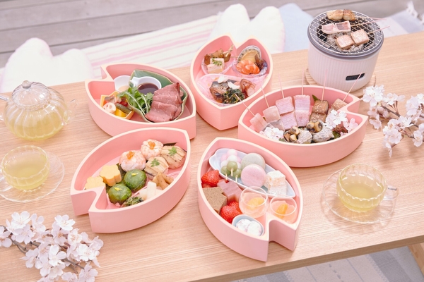 お花見のおともにぴったりな桜の花びら型のランチボックスを用意します。ランチボックスを彩るのは、海老のてまり寿司や三色団子など見た目からも春を感じる華やかな料理です。熱海の名物である干物は、七輪で炙ることができるので、香ばしい風味を存分に楽しめます。桜を眺めながら、広々としたテラスで味わいたくなるランチボックスです。