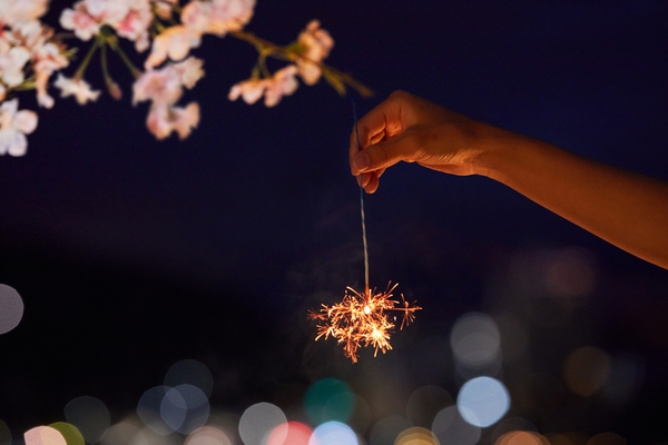 ライトアップした桜を眺めながら、幻想的な雰囲気のテラスで線香花火を楽しみます。線香花火は、テラスリビングコーナーから見える景色をイメージした、リゾナーレ熱海オリジナルデザインです。線香花火と一緒に用意したロゼスパークリングワインを味わい、寝る直前まで桜を堪能できます。
