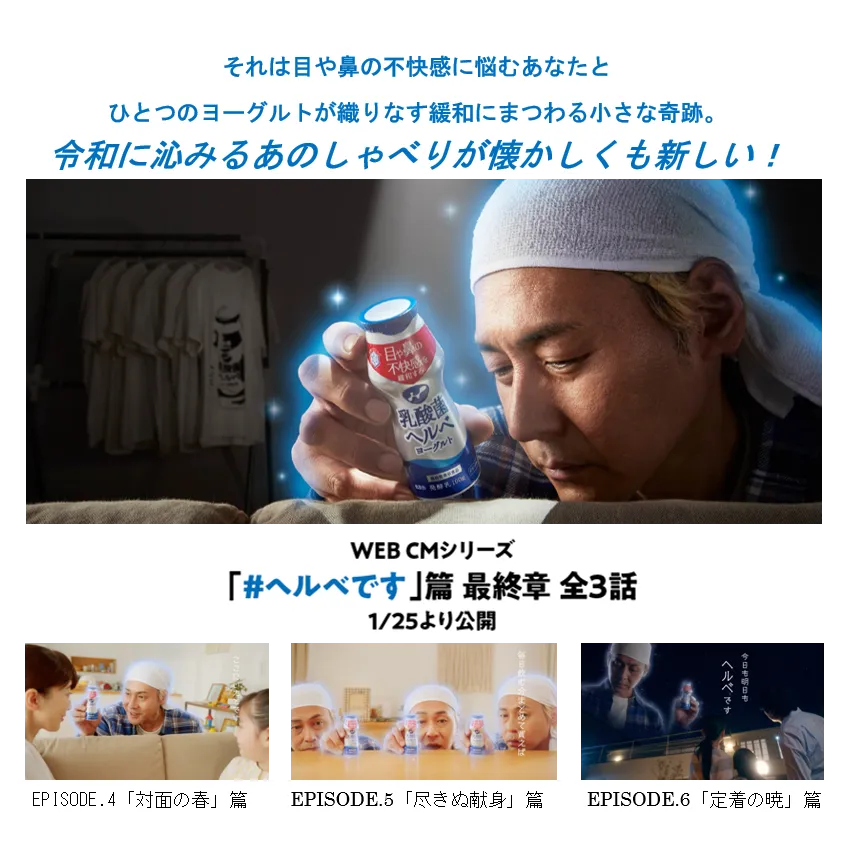 このたび、多くの皆さまに、「乳酸菌ヘルベヨーグルト」シリーズをお試しいただきたく、1月25日(火)より、Amazonギフト券が当たる、目鼻の不快感にはじめるとです。「ヘルベ」の出番です。キャンペーンを実施します。同時に、2021年10月から公開している連続WEB CMの第2弾がスタート。第1弾では声だけの出演だった、お笑いタレントのヒロシ氏がついに登場します。