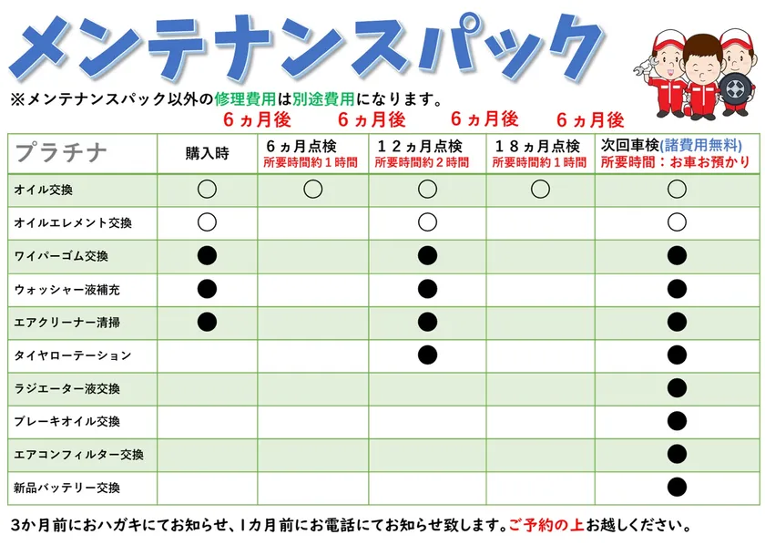 「ご購入いただいたら終わり」ではなく、車はアフターメンテナンスが大切です。ご購入後、6ヵ月ごとの定期点検無料や、オイル交換無料、2年後の車検も諸費用無料になるサービスが『プラン』に組み込まれています。