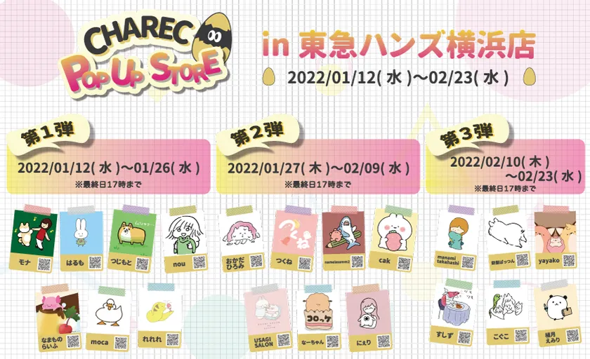株式会社東急ハンズ(本社:東京都新宿区)が手掛けるクリエイターサービス「CHAREC(キャレク)」は、東急ハンズ横浜店(神奈川県横浜市西区)にて2022年2月23日(水)までの期間、「CHAREC POPUP STORE」イベントを開催中です。