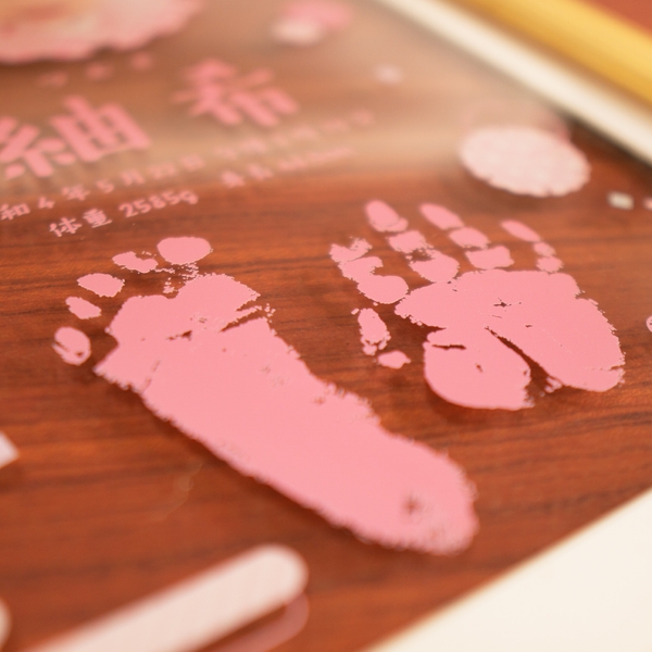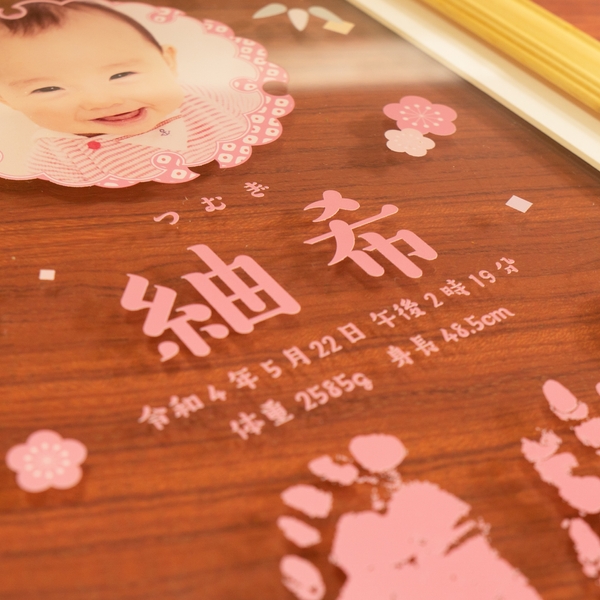 お子さまのお名前、お誕生日などの出生情報の他、生まれた時の小さいおてて、あんよをそのまま手足形にしてプリントできます!