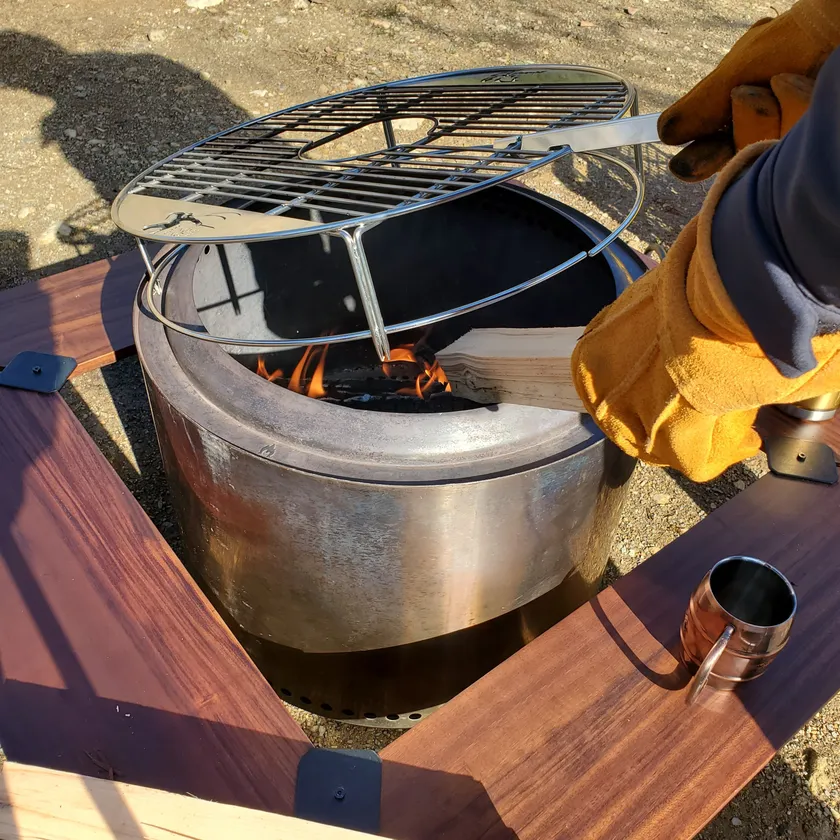 「SINOBI RING(シノビリング)B」は、中型サイズのファイヤーピット(焚火台)「solo stove社 ボンファイヤー」(※)に設置する調理用五徳(ゴトク)です。製品の中央や側面に開口部が設けてあり、その開口部より燃焼に必要な薪を追加投入することが可能です。また、製品には専用のトングハンドルも付属しています。