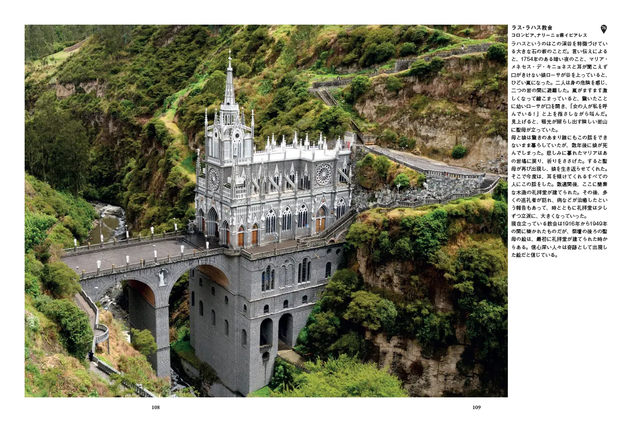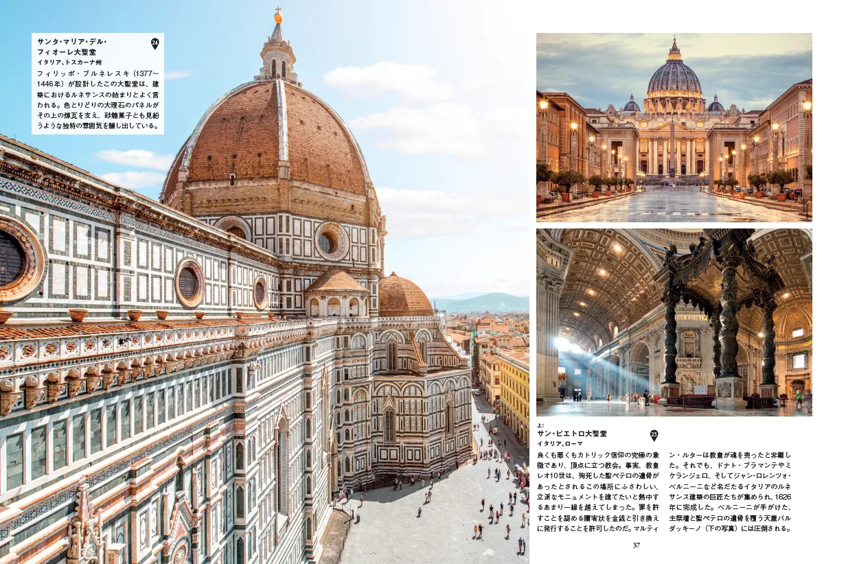 優美なルネサンス建築として人気が高く世界遺産でもあるフィレンツェのサンタ・マリア・デル・フィオーレ大聖堂、神父が自ら内装のだまし絵を仕上げたハワイの小さな教会セント・ベネディクト・カトリック、奇跡の黒い聖母が何度も現れたコロンビアの天使の聖母教会、インドに出現して病気を癒したという聖母マリアの像がインドネシアに伝わり、それ以降聖地となったグラハ・マリア・アナイ・ベランカニ教会、モダンなコンクリート造りのサクレクール・ダルジェ大聖堂……。世界的に有名な大聖堂はもちろんのこと、地元で愛される小さな教会や、こうした本ではあまり取り上げられないような独自の伝統をもつ世界各地の教会も取り上げています。