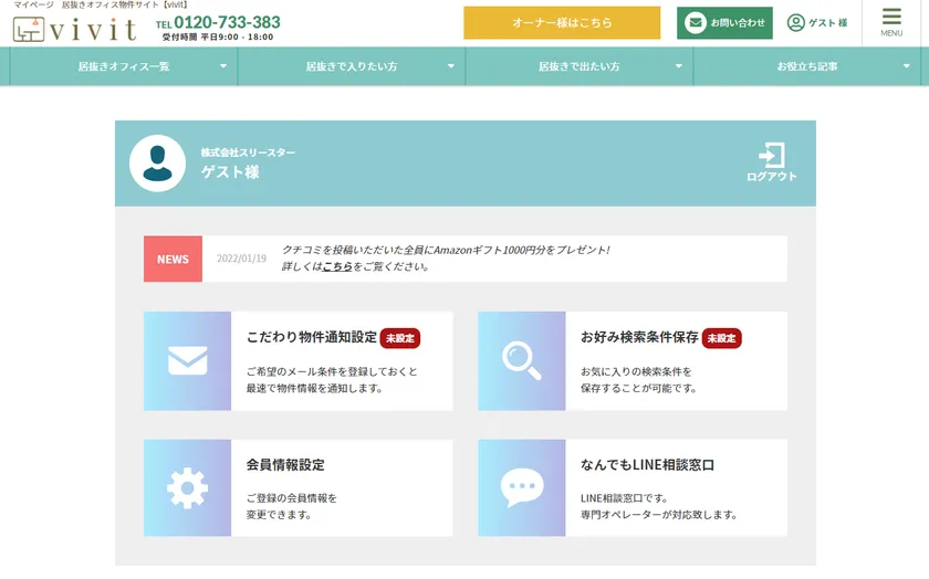 株式会社スリースター(所在地:東京都港区西新橋、代表取締役:小川 雅義、以下 スリースター)は、運営する居抜きオフィス物件サイト「vivit」にマイページ機能を2022年1月25日に追加しました。