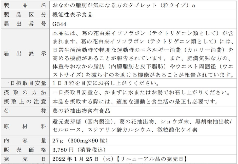 「おなかの脂肪が気になる方のタブレット(粒タイプ)」は、機能性関与成分として葛の花由来イソフラボン(テクトリゲニン類として)を一日摂取目安量3粒当たり35mg含有した機能性表示食品です。葛の花由来イソフラボン(テクトリゲニン類として)には、日常生活活動時や軽度な運動時のエネルギー消費(カロリー消費)を高める機能があることや、肥満気味な方の、体重やおなかの脂肪(内臓脂肪と皮下脂肪)やウエスト周囲径(ウエストサイズ)を減らすのを助ける機能が報告されています。このたび、その成分特徴を生活者の皆さまに分かりやすく伝えられるように、「日常生活活動時や運動時のエネルギー消費を高めるのを助ける」という機能性表示を追加しパッケージ前面にも掲出いたしました。