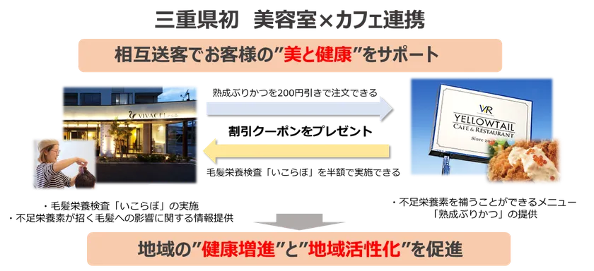 VIVACE!では、ミネラル不足が毛髪や身体に与える影響を来店者に伝えると同時に、それらを補うことができるYellowtail cafeの「三重県民のための熟成ぶりかつ」を紹介し、200円割引クーポンを配布します。