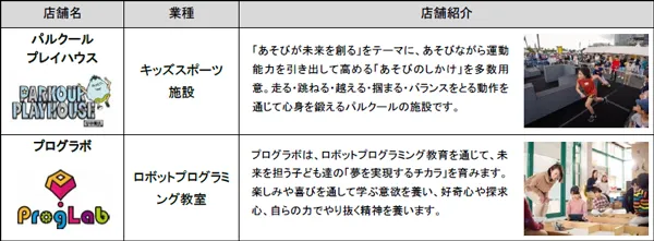 関西初出店となるキッズスポーツ施設「パルクールプレイハウス」やロボットプログラミング教室「プログラボ」が並ぶ、スポーツ・学び・子育てをテーマとしたフロアです。