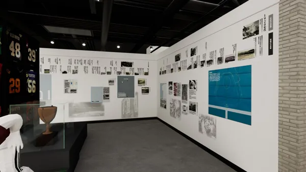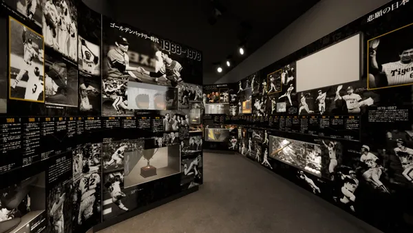 阪神タイガースの歴史を球団創設から8つの時代に分け、各時代の選手や出来事を年表に沿って紹介。写真や解説とともに展示品を壁面に埋め込むことで、展示品にまつわるストーリーをより分かりやすく、映像を通じて各時代への理解がより深まります。
