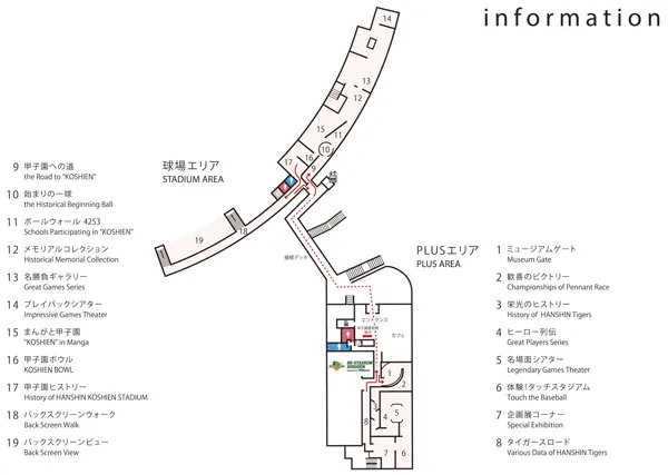 甲子園プラス2Fの「PLUSエリア」と、阪神甲子園球場2Fの「球場エリア」の2か所に展示エリアを設け、両エリア同士を陸橋でつなぎます。