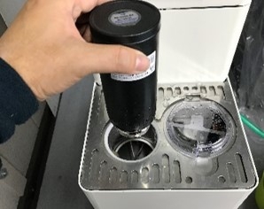 (1)マイボトルの本体を逆さにして洗浄機(左側の穴)に差し込みます。
