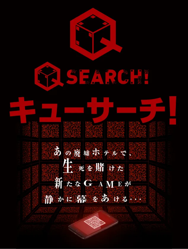 「キューサーチ!」は、リアル廃墟にまつわる怨念の鎮魂をゴールとし、その最終目的地を目指して数多くの条件をクリアし先へ進むアトラクションです。リアル廃墟ホテルの館内に仕込まれた無数のQRコードをお手持ちのスマートフォンで読み取り、猟奇殺人の世界観を堪能できます。QRコードには、物語・ヒント・メッセージなど重要な情報が入っています。お手持ちのスマートフォンはQRコードを読み取る以外にも、(1)館内を照らす、(2)主催者との連絡手段、(3)情報受信、(4)その他アプリの利用などを駆使するために必須です。制限時間は40分間。参加者全員で協力してQRコードを数多く読み取り、効率よくゴールを目指すコミュニケーション能力が必要不可欠です。