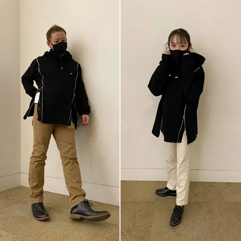 両肩から裾まで両サイド全開閉可能のジッパーが一番の特徴です。ジップのアレンジで、ウエストラインを綺麗に、脚長シルエットの演出ができます!