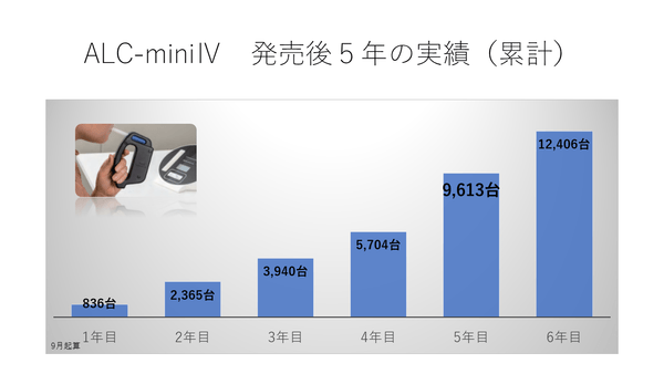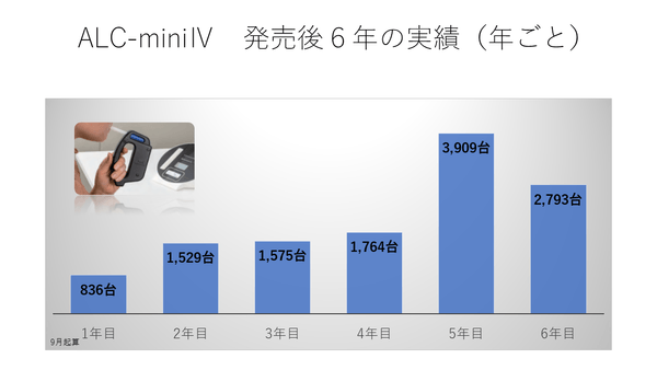 2023年2⽉頃から出荷が再開されましたが、部品不⾜の影響を受け、結果、ALC-miniⅣの6年⽬の実績は前年⽐減となりました。⼀⽅で累計では、発売から順調に推移し、6年⽬を迎え累計出荷数は1万台を超えました。